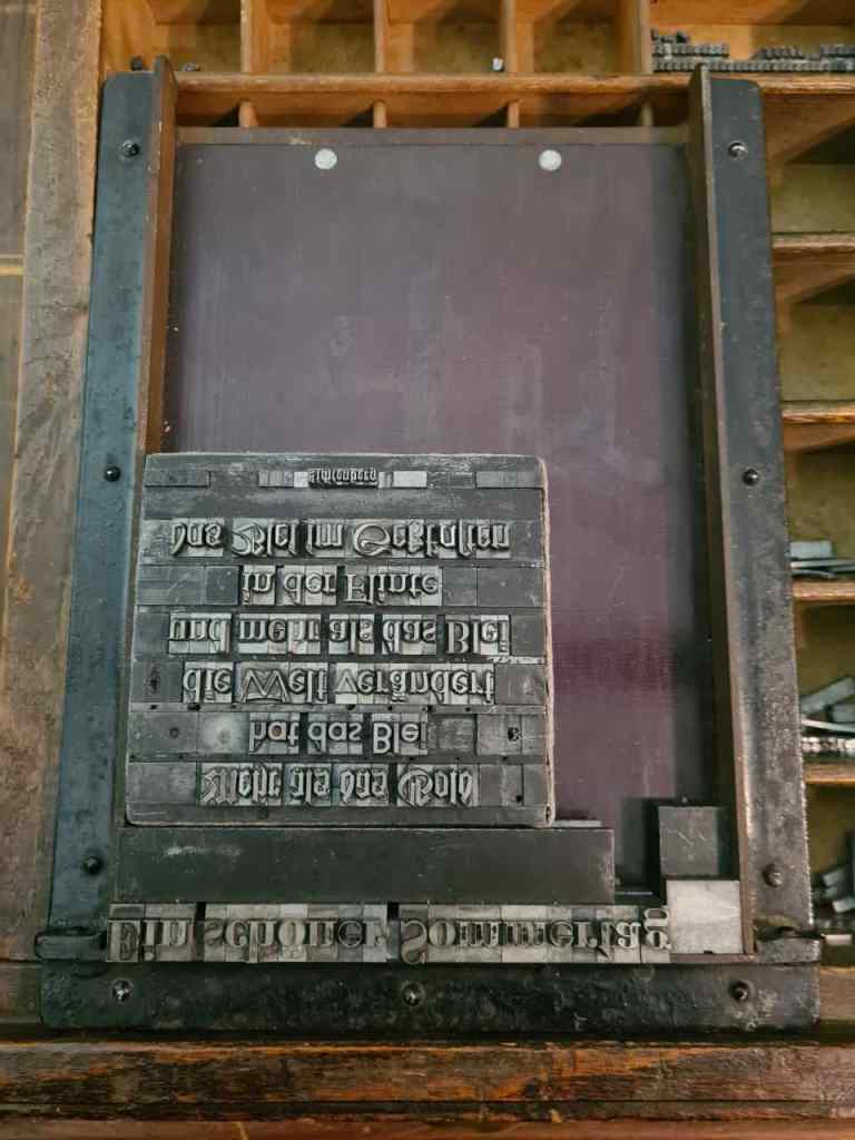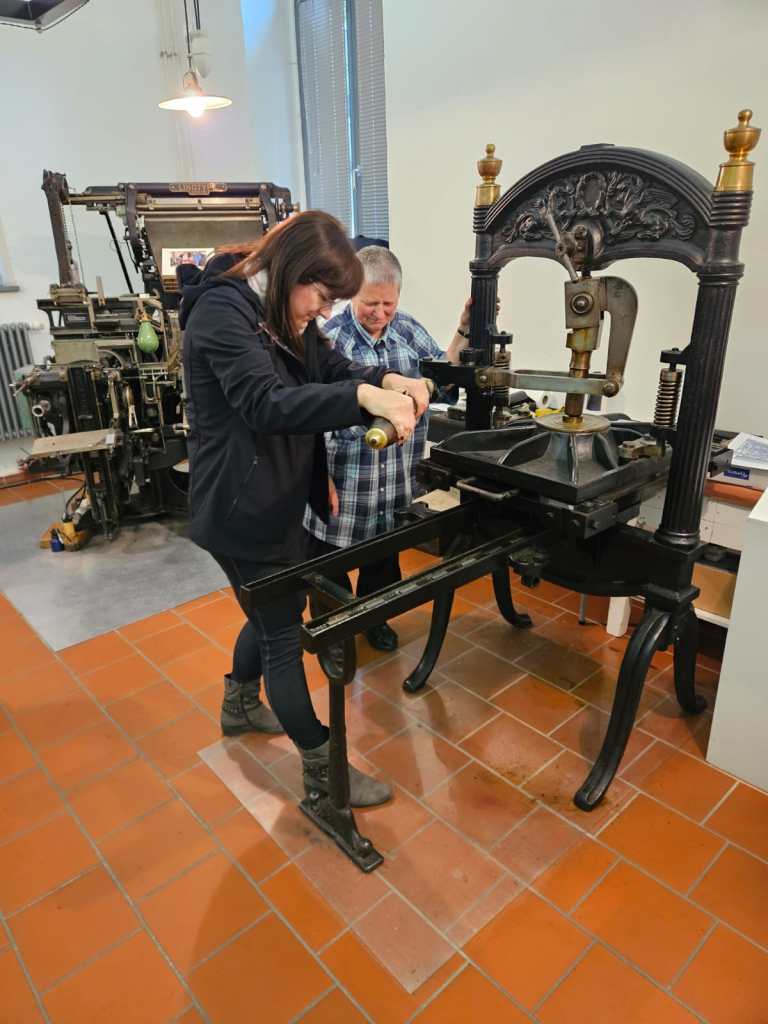 Los ging’s im Druckereimuseum und Schaudepot Benary-Speicher. Das befindet sich im Sparkassen-Finanzzentrum und ist sehr gut mit der Straßenbahn (Linie 2) erreichbar. Hier konnte man sich über alte Drucktechniken sowie die dazu gehörigen Maschinen informieren. Und was noch viel besser ist, man hatte Gelegenheit an einer dieser alten Druckerpressen unter Aufsicht selbst etwas zu drucken! Eine wunderbare Gelegenheit sich mal (wieder) vor Augen zu führen, wie früher gearbeitet wurde und wie verwöhnt man heutzutage mit unter ist. Das Schaudepot war im Obergeschoss. Hier konnte man Stücke aus der Südseesammlung sowie der Sammlung Kämmerer bestaunen. Beide Etagen waren durch die Sonderausstellung „ZWISCHEN REALITÄT UND ROMANTIK.Menschenbilder von Horst Wagner in Malerei und Grafik“ verbunden.