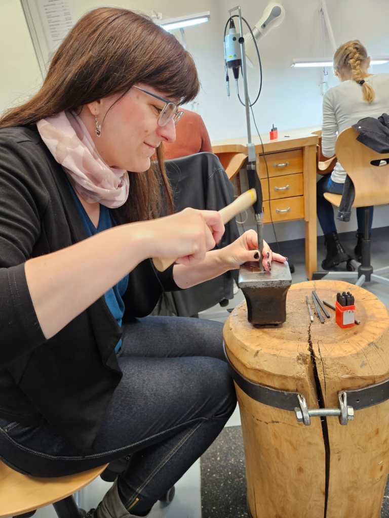 Nach einer kleinen Stärkung ging es dann erneut mit der Straßenbahn weiter zu den Künstlerwerkstätten in die Nordhäuser Straße. Hier konnte man zahlreiche Ateliers von Künstlern besichtigen und mit diesen auch ins Gespräch kommen. Neben Collagen aus Papier, abstrakten Acrylbildern und Fotografien waren noch weitere Stilrichtungen vertreten. Zusätzlich gab es einige Mitmachangebote. So konnte man zum Beispiel kleine Metallplättchen u.a. mit Punzen bearbeiten und einen kleinen Einblick in die Arbeit eines Goldschmiedes erhalten.