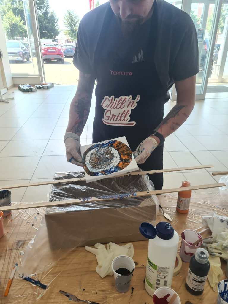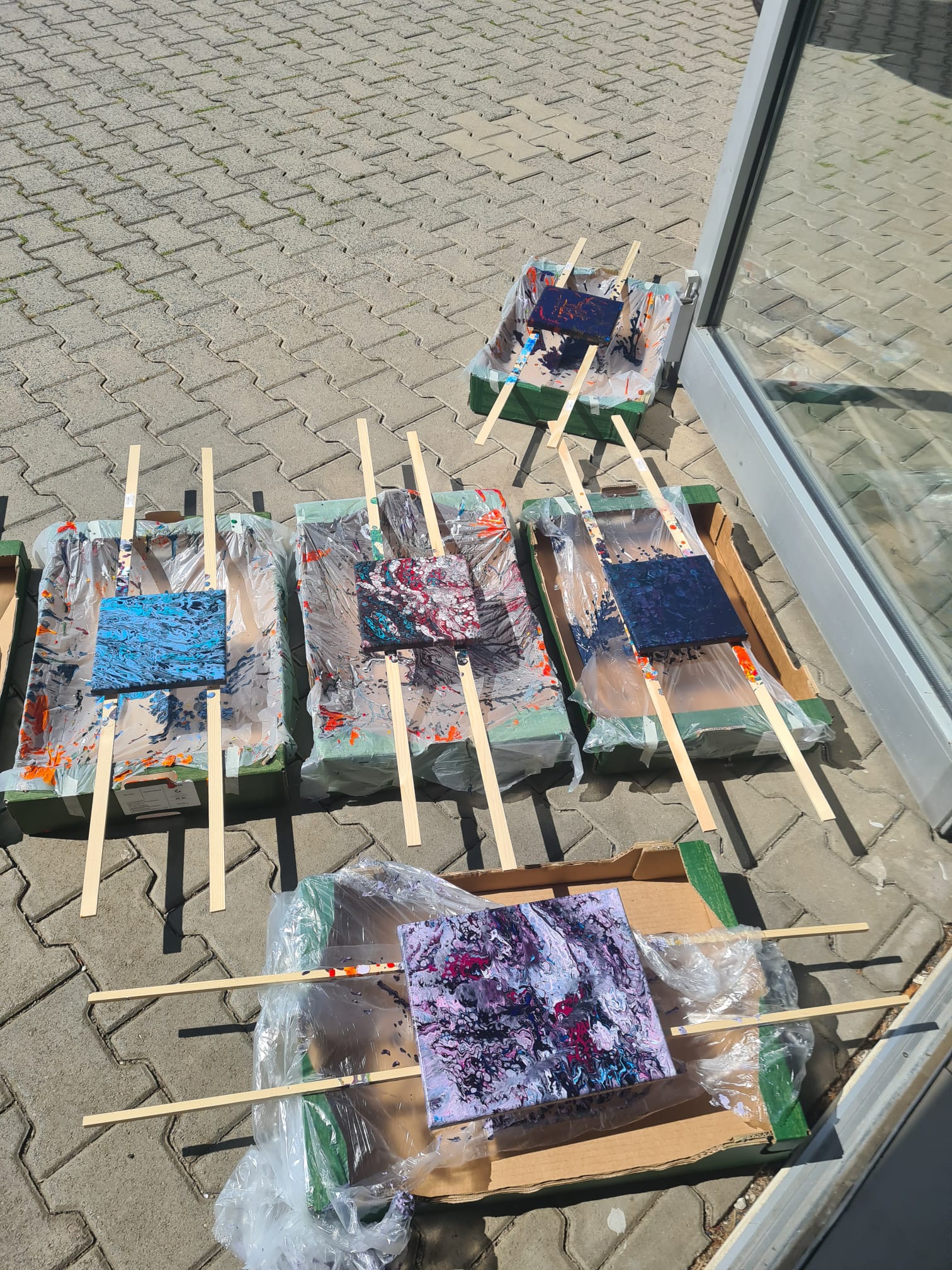Am vergangenen Samstag durfte ich im Autohaus Am Alten Gaswerk einen Workshop zum Thema Acrylic Pouring geben. Mit etwa 10 Teilnehmern, hauptsächlich Angestellte des Autohauses bzw. deren Familienangehörigen, war er gut besucht.