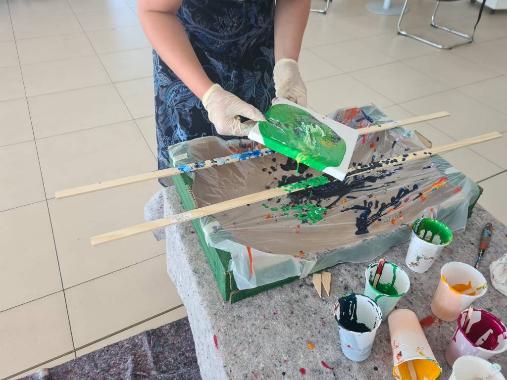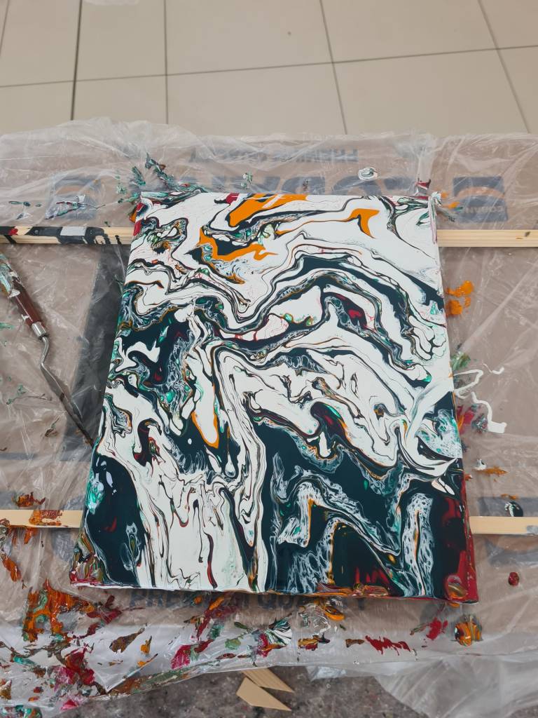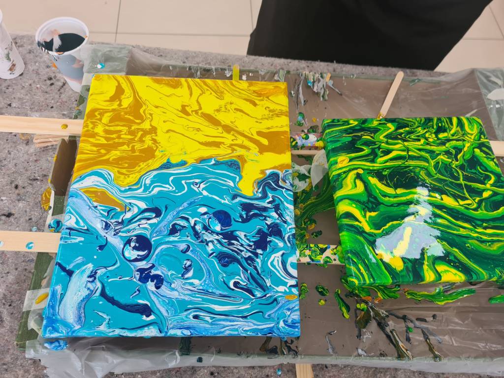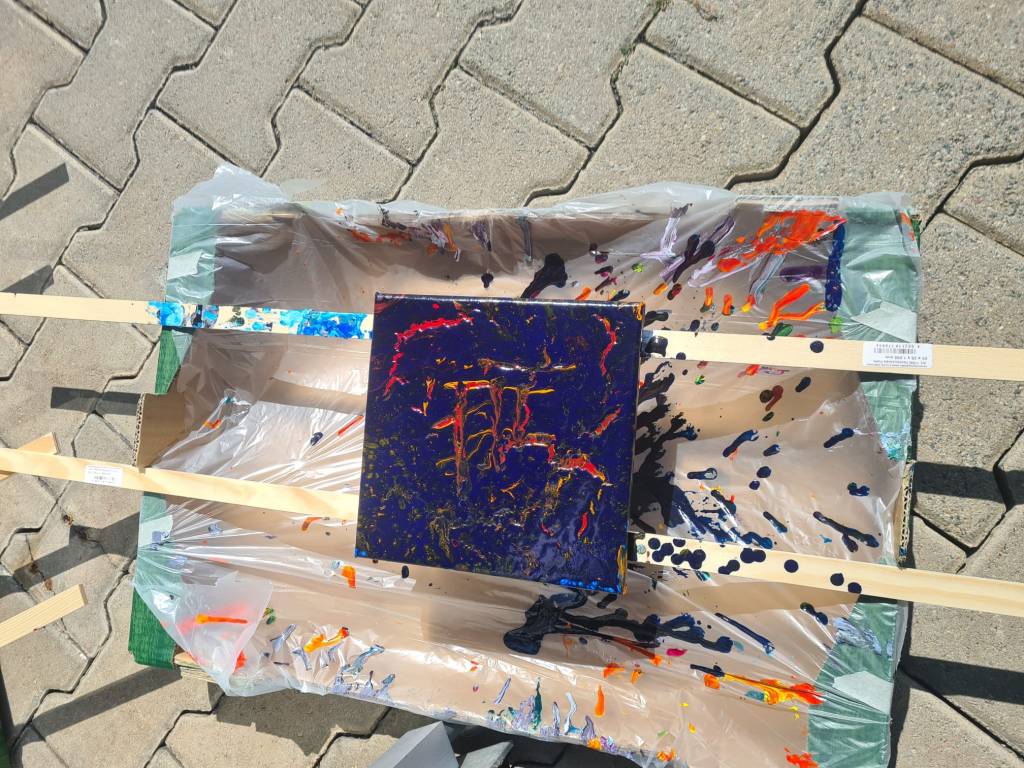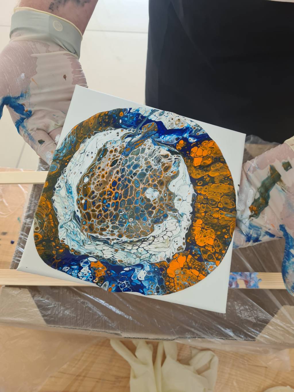 In dem etwa zweistündigen Kurs konnten die Teilnehmer einiges über das Acrylic Pouring lernen und was noch viel wichtiger ist, sich in dieser Technik auch selbst ausprobieren. Dabei hatten sie sichtlich Spaß uns es sind einige sehr interessante Werke entstanden, die ich euch nicht vorenthalten möchte.
