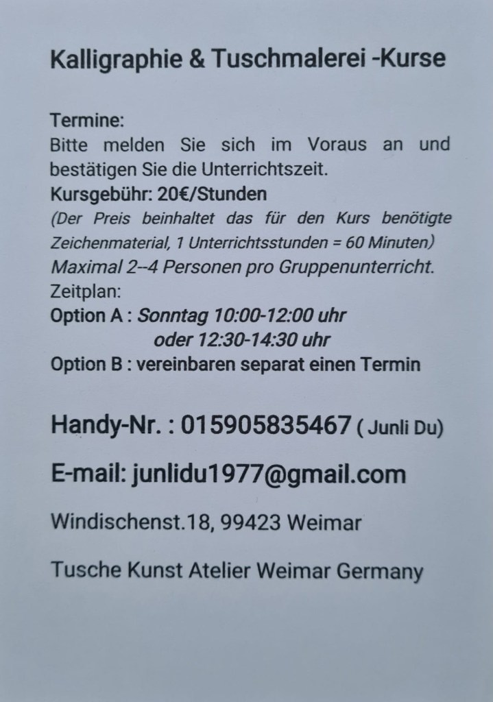 Im letzten Jahr habe ich zu meinem Geburtstag einen Gutschein für das Tusche Kunst Atelier Weimar bekommen und nachdem ich am letzten Samstag zum Tag des offenen Ateliers Gelegenheit hatte, einen Termin auszumachen, war es heute endlich soweit.