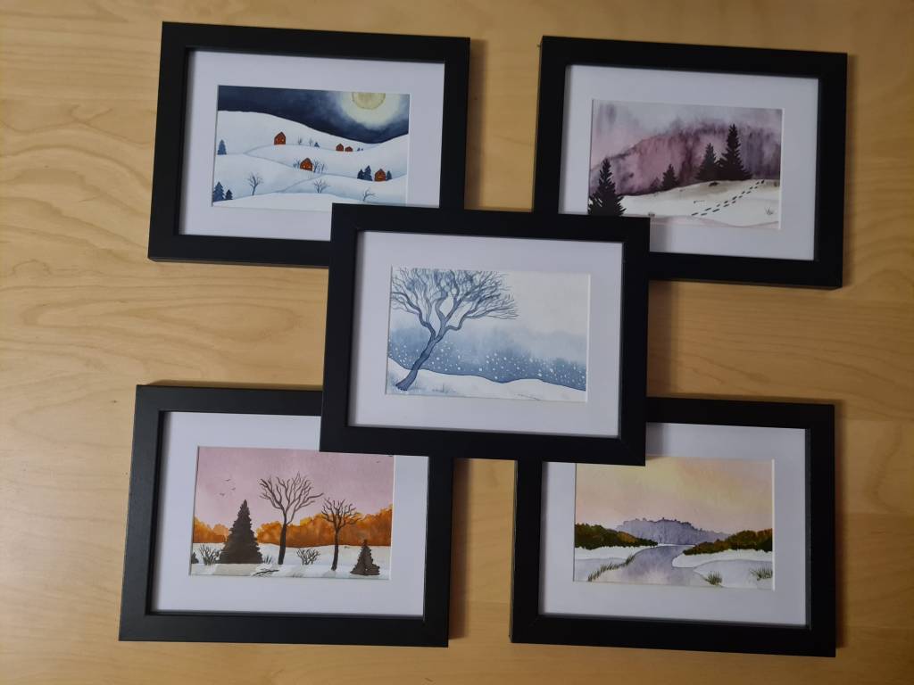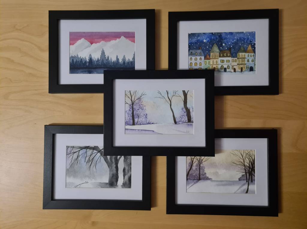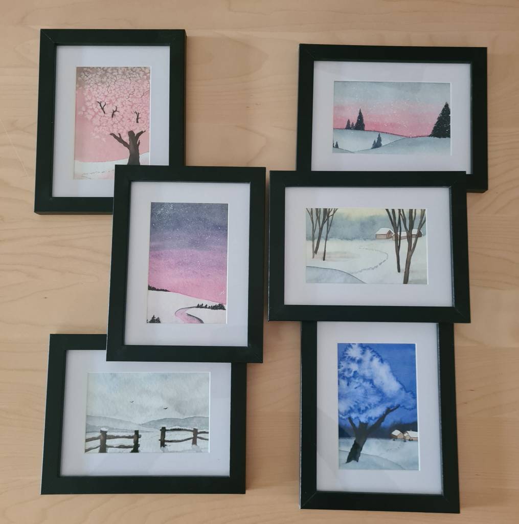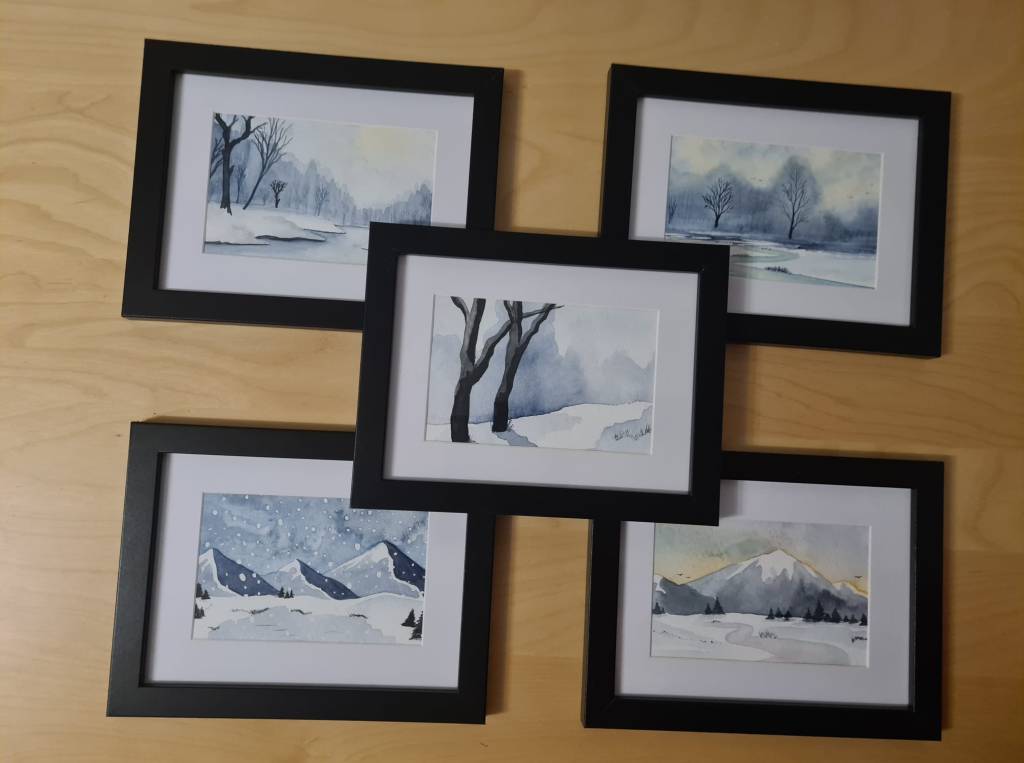 Die Bilder selbst zeigen verschiedene Wintermotive. Manche sind eher schlicht gehalten, andere überzeugen durch Ihre kräftigen Farben und während ich bei einigen mit Salz gearbeitet habe, kamen bei anderen Metallicfarben zum Einsatz.